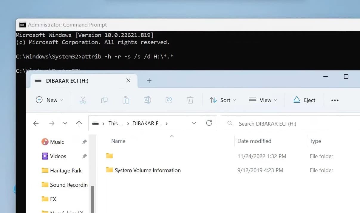 Dosya geçmişi yedeklemelerine veya başka bir yedekleme çözümüne erişiminiz yoksa,Üçüncü taraf yazılımı olmadan silinen dosyaları kurtarKomut istemini kullanarak. Bu yöntem,Atıf, dosya özniteliklerini değiştirebilir veya görüntüleyebilir. Bu komutu belirli parametrelerle kullanarak, kötü amaçlı yazılım veya diğer nedenlerle silinmiş gizli dosyaları bulabilir ve geri yükleyebilirsiniz.