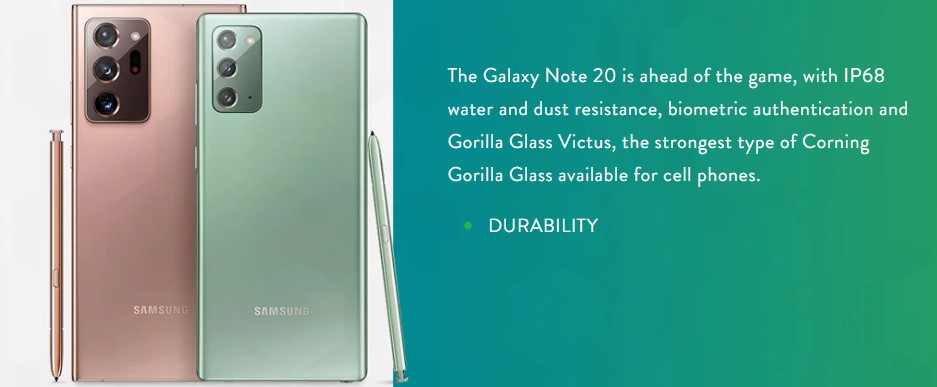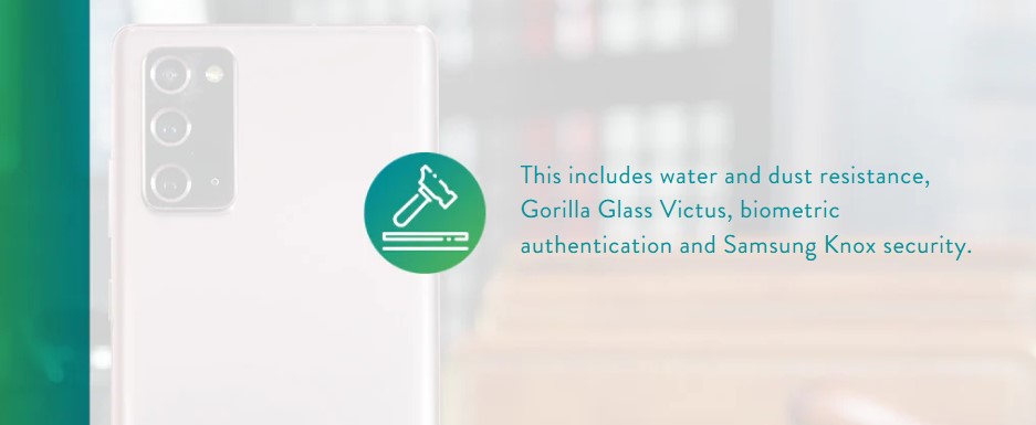 Galaxy Note 20, cep telefonları için mevcut olan en güçlü Corning gorill camı olan IP68 su ve toz direnci, biyometrik kimlik doğrulama ve Gorilla Glass Victus ile oyunun önünde.Tek bir kuvvet testinde, ekran 11 5 metrelik ayrı, yüz aşağı damlalar ve çizik olmadan kaçtı. Yeni Galaxy notları ayrıca, kurcalamaya, veri maruziyetine ve diğer tehlikelere karşı koruyabilen yerleşik bir katmanlı güvenlik sistemi olan Samsung Knox ile donatılmıştır.