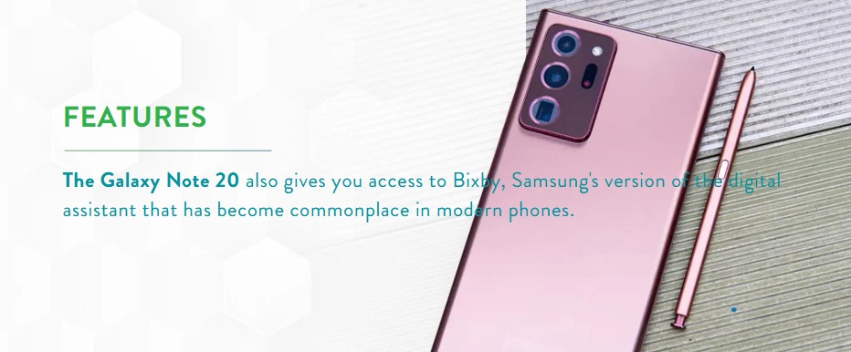 Galaxy Note 20 ayrıca Samsung'un modern telefonlarda yaygınlaşan dijital asistan versiyonu Bixby'ye erişim sağlar. Bixby size yardımcı olabilirCihazınızın kontrolünü ele alalımHatırlatıcıları ayarlayın ve sizin için takvim etkinliklerini planlama gibi tüm tipik asistan yollarında, ancak maksimum verimlilik için ek özellikler de kullanabilirsiniz. Bixby rutinleri, notunuzun kalıplarınızı öğrenmesini ve mevcut rutinlerinize göre önerilerde bulunmasını sağlar. Örneğin, genellikle 23:00 civarında yatarsanız, Bixby her gece mavi ışığınızı ve parlaklığınızı otomatik olarak düşürmeyi öğrenebilir. Bixby, fotoğraf çekmenize ve erişilebilirlik özelliklerini etkinleştirmenize yardımcı olabilir. Mobil asistanınızı, tamamen entegre bir ev için Samsung Televizyonlar ve Işıklar da dahil olmak üzere diğer Samsung cihazlarınızla senkronize edebilirsiniz.