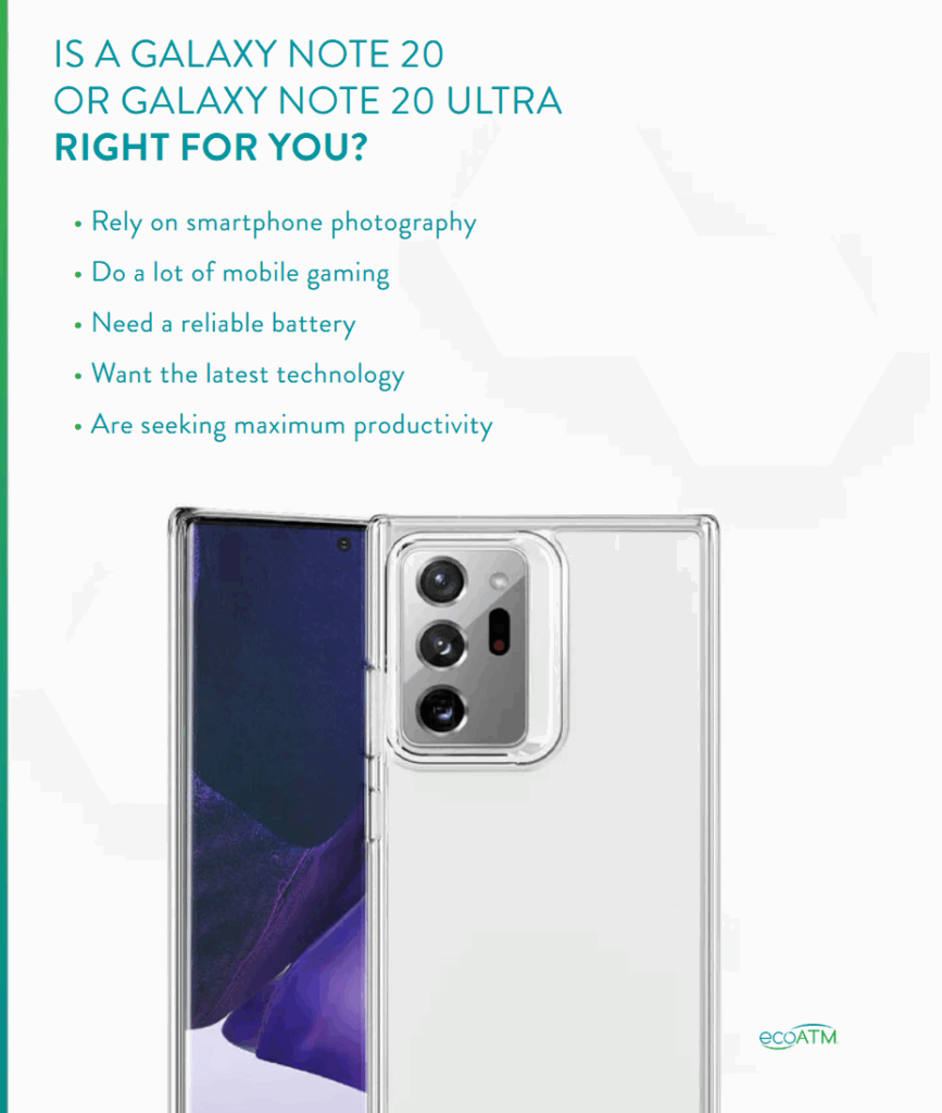 Galaxy Note 20'ye yükseltmeyi veya 20 Ultra'yı tercih etmeyi seçin, ECOATM eski cihazınızı geri dönüştürmenize yardımcı olmak için burada. .Süreç kolaydır- Mevcut telefonunuzu sıfırlayın, birYakınınızda Ecoatm kioskve eski akıllı telefonunuz için nakit ticareti yapacağız. Bu, çevremizde daha az zararlı e-atık ve yeni notunuza doğru daha fazla para anlamına gelir. Cihazınızda işlem yapmanın nasıl olabileceği hakkında daha fazla bilgi edinmek için web sitemizi keşfedinbüyük bir etki yaratmakçevrenizdeki dünyada.