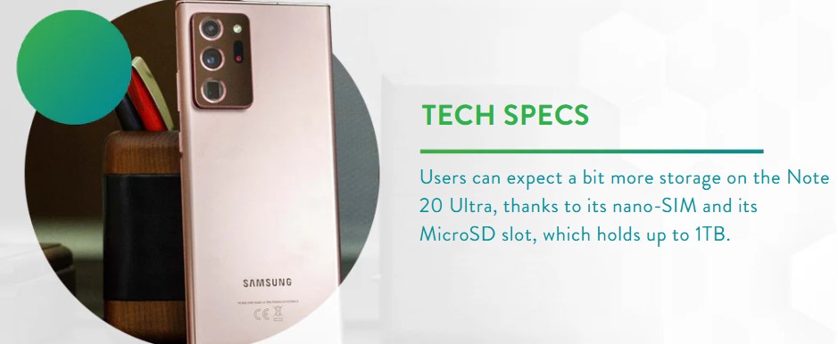 Kullanıcılar, Nano-SIM ve 1 TB'a kadar olan MicroSD yuvası sayesinde Note 20 Ultra'da biraz daha fazla depolama bekleyebilirler. Dahili depolama, her biri 12GB RAM içeren 512GB veya 128GB içerir. Düz bir ekran yerine, 20 ultra, bu sefer net renk ve tiyatro benzeri izleme deneyimi sağlayan dinamik AMOLED 2x ile HDR10+ile bir Edge Infinity-O ekranı içerir.