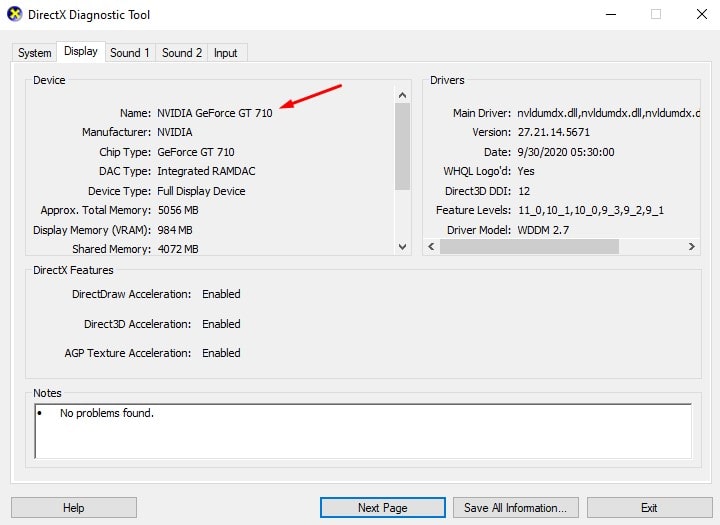 - Bu da DirectX teşhisini açacak, ekran sekmesine geçecek ve ekranınız için gereken sürücüyü not edecektir. (Benim için Nvidia GeForce GT 710