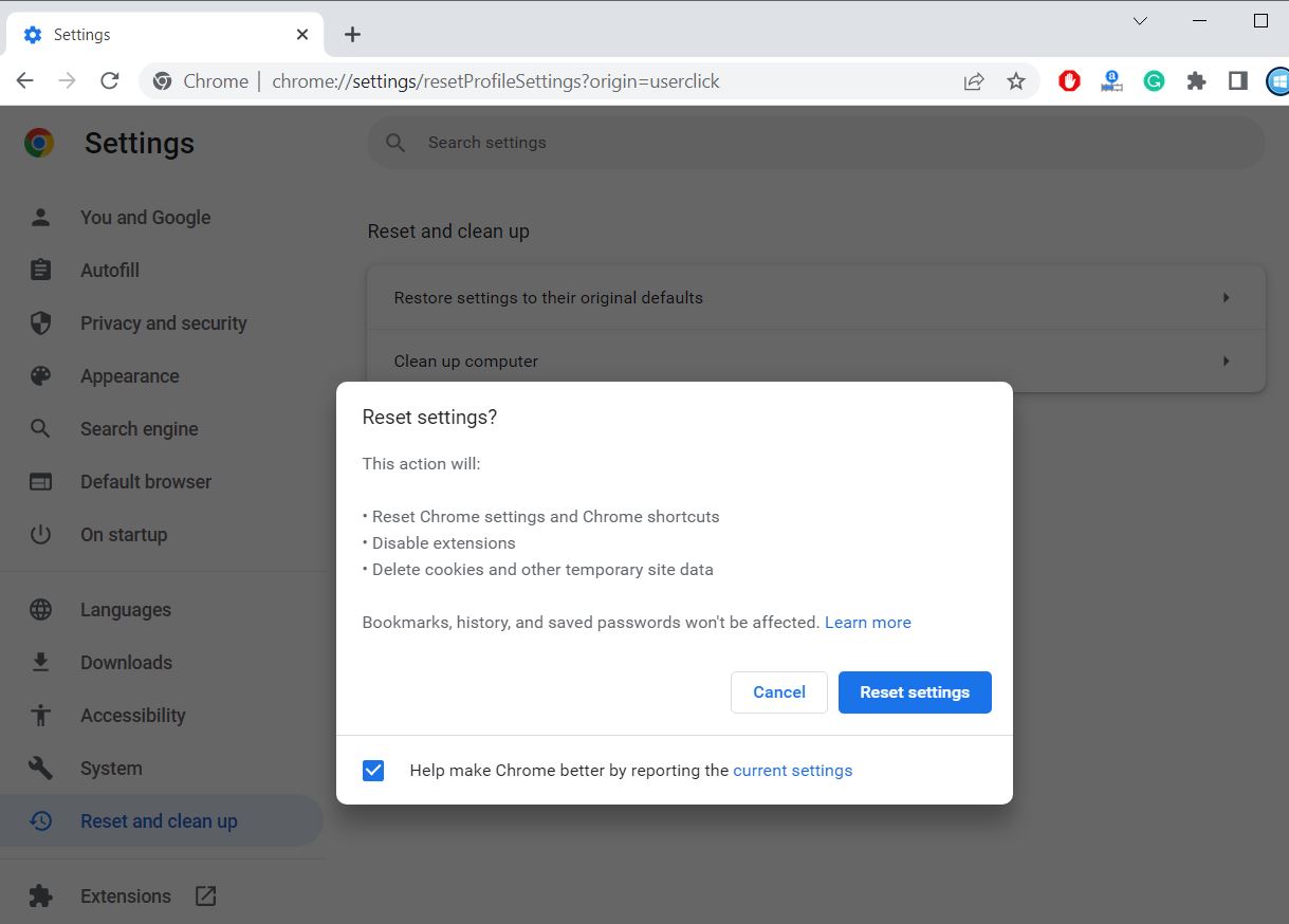 Yukarıdaki yöntemlerle sorun çözülemiyorsa ve yalnızca Chrome tarayıcısında karşılaşıyorsanız Chrome'u sıfırlamanızı öneririm. Tarayıcıyı varsayılan durumuna geri yükler, olası çakışmaları ortadan kaldırır ve Chrome'un sorunsuz çalışmasına olanak tanıyarak web sitelerine istikrarlı bir bağlantı sağlar ve bağlantı sıfırlama hatasını çözer.