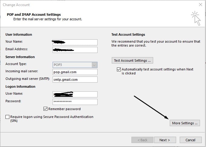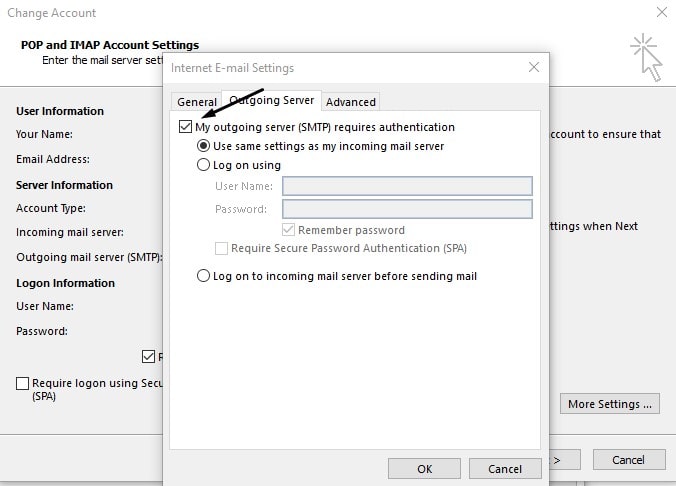 Hesap ayarlarını kontrol ederken, kullanıcı adının içinde tüm e -posta adresine sahip olduğundan emin olun. Ayarları yapılandırma prosedürü, MS Outlook'un farklı sürümlerinde farklılık gösterebilir. Böylece ayrıntılar için Microsoft sitelerine başvurabilirsiniz.