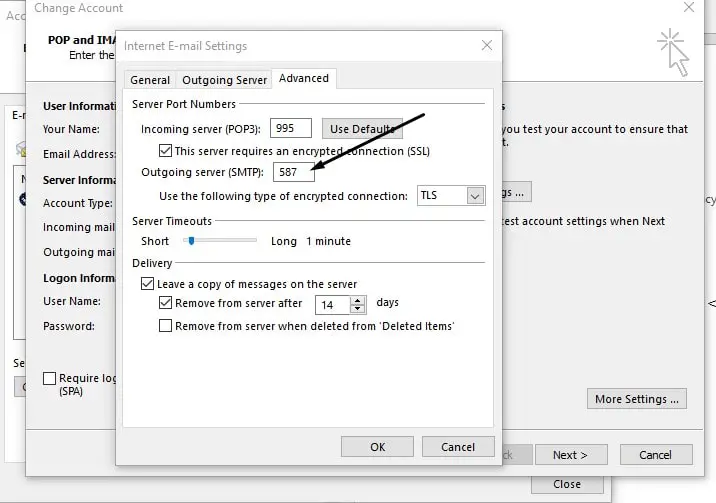 Giden sunucuyu yapılandırdıktan sonra Gelişmiş sekmesine geçin ve Outlook sunucusu bağlantı noktası numarasını 587 olarak değiştirin.