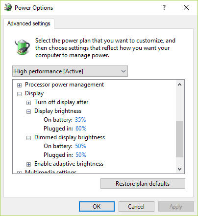 Not: Bazı kullanıcılar, ekran parlaklığını özelleştirmelerini sağlayan güç seçeneklerinden sapma uyarlanabilir parlaklık seçeneğini bildirir. Ayrıca bu “sapma uyarlanabilir parlaklığı” da deneyebilir ve size yardımcı olabileceğini kontrol edebilirsiniz.