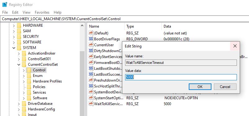 Not: WaittokillserviceTimeout bulamazsanız, kontrolü sağ tıklayın -> Yeni> Dize değerini tıklayın ve bu dizeyi şöyle adlandırın.WaittokillserviceTimeout.Ardından 1000 ile 20000 arasında değeri ayarlayın
