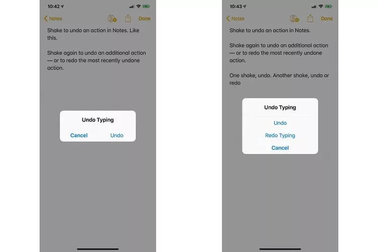 Bu bir yoliPhone notlarında sallamadan geri almabuna üç parmakla kaydırma yöntemi denir. Notes'u kullanırken önceki bir eylemi geri almak için de hareketleri kullanabilirsiniz. iPhone'da, ekranda herhangi bir yere iki kez dokunmak için üç parmağınızı kullanarak bir eylemi geri alabilirsiniz. Bunu seçtiğinizde en son girilen içerik silinir. Ekranın soluna doğru üç parmakla kaydırma da en son düzenlemeyi geri alır. Bir işlemi geri aldığınızda ekranın üst kısmında bir onay mesajı görünür.