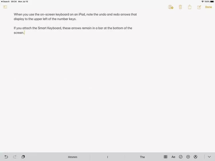 Apple Magic Keypad gibi Bluetooth klavyeli bir iPhone veya iPad'deki notlar, klavyeye yalnızca birkaç dokunuşla geri almanıza ve yeniden yapmanıza olanak tanır. Bir değişikliği geri almak için tuşuna basınKomut+Zve bunu yeniden yapmak için tuşuna basınShift+Komut+Z. Bu tuşlara tek bir dokunuşla birçok aktiviteyi geri alabilirsiniz (veya yeniden şekillendirebilirsiniz).