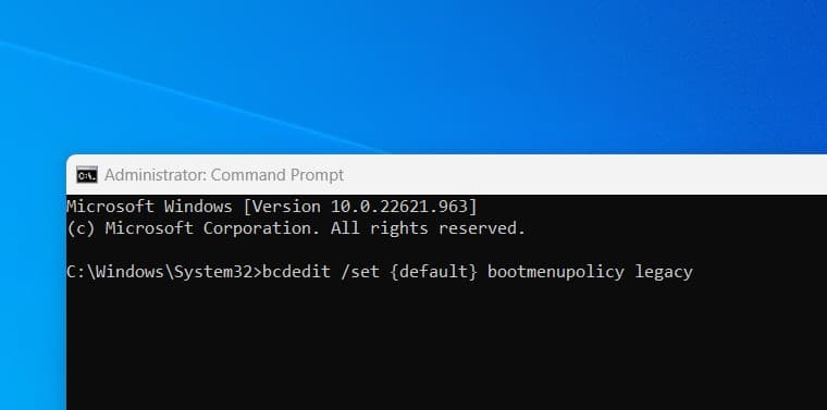 Ayrıca, bu komutu çalıştırabilirsinizbcdedit /set {varsayılan} bootmenupolicy mirasıWindows 11/10'da F8 Anahtar Güvenli Modu seçeneğini etkinleştirmek için.