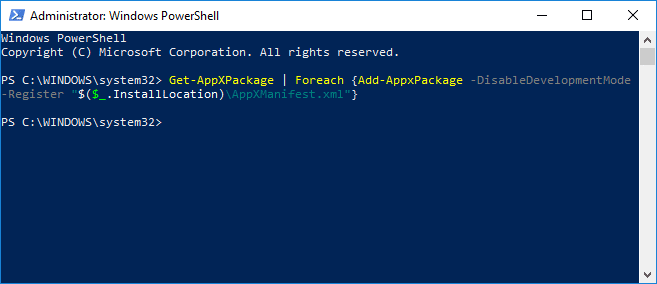 Get -Appxpackage -Allusers | Foreach {add -appxpackage -disableedevelopmentMode -register “$ ($ _. İnstallLocation) appxmanifest.xml”}