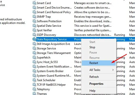 Yüksek CPU veya bellek kullanımına neden olan belirli bir hizmet fark ettiğinizde, bunun nedeni bir nedenden dolayı sıkışmış olabilir.Devlet Deposu Hizmetini Yeniden BaşlatmaGeçici aksaklıkları veya yüksek CPU kaynaklarını tüketmesine neden olan sorunları çözebilir. Esasen hizmeti sıfırlar ve yeni başlamasına ve potansiyel olarak altta yatan sorunları çözmesine izin verir. Bu, çoğu kullanıcının bilgisayarlarında Durum Deposu Hizmeti Yüksek CPU problemini düzeltmesine yardımcı olan hızlı ve kolay çözümdür.