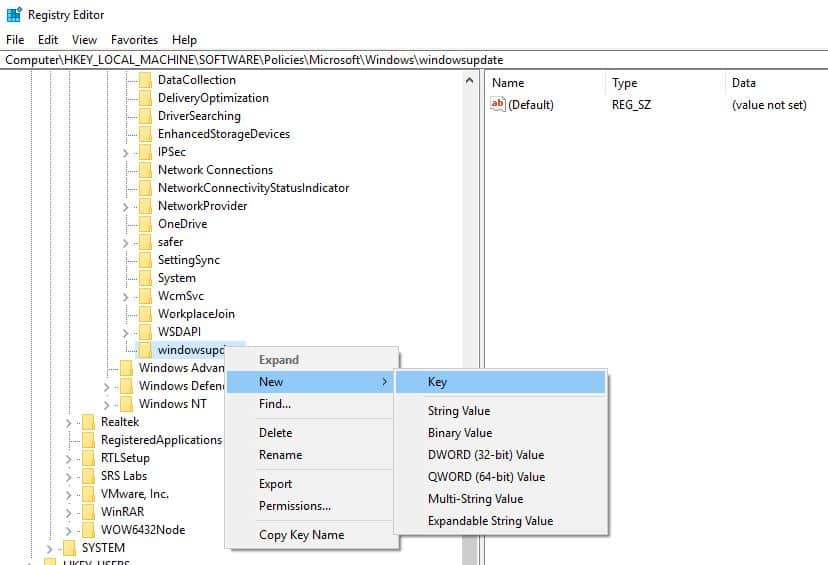 Ardından Windows'a sağ tıklayın, Yeni -> Anahtar'ı seçin ve adlandırınWindowsupdate. Yine, Windows Update, yeni -> tuşuna sağ tıklayın ve AU adını verin.