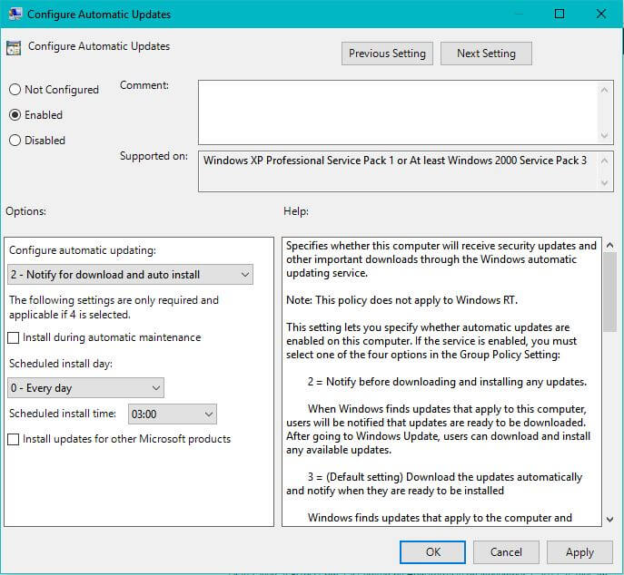 Şimdi sağ tarafta,Otomatik güncellemeleri yapılandırınAyarlar listesinden ilke. Sonra sol tarafta,EtkinleştirilmişPolitikayı etkinleştirme seçeneği. Sonra Seçenekler Altında Seçenek 2 -"İndirme ve otomatik yükleme için bilgilendirin"Güncellemelerin otomatik yüklemesini durdurmak için. Değişiklikleri yapmak için Uygula ve Tamam'ı tıklayın.