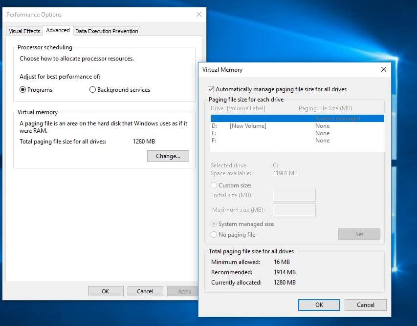 Normalde, Windows 10 için tüm sayfalama dosyaları için varsayılan boyut, Windows'un boyutu yönetmesine otomatik olarak izin verir. Ancak varsaOptimizasyon için sanal belleği ayarladısayfa dosyasını özel ve önceden ayarlanmış bir değer olarak amaçlar veya değiştirir. İşlem tarafından 100 disk kullanımına veya yüksek CPU kullanımına yol açabilir. Ve sayfalama dosyası boyutunu otomatik olarak değiştirmek bu sorunu çözebilir.