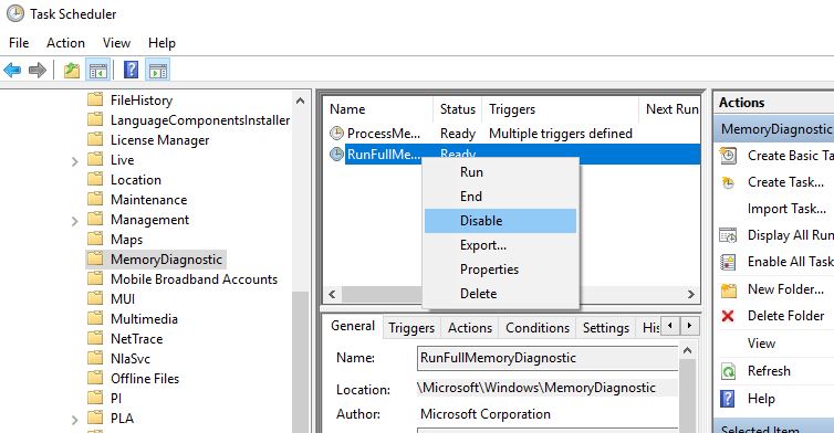 - Burada, aşağıdaki görevi arayın ”RunfullMemorydignosticentry”Üzerine sağ tıklayın ve devre dışı bırak seçeneğini seçin.