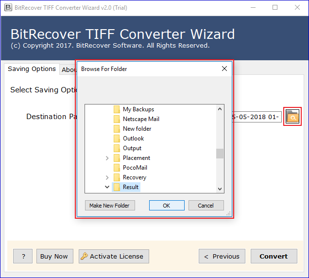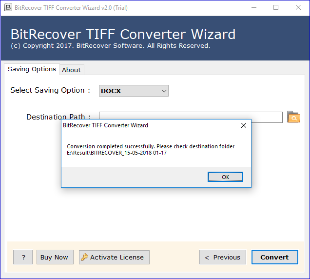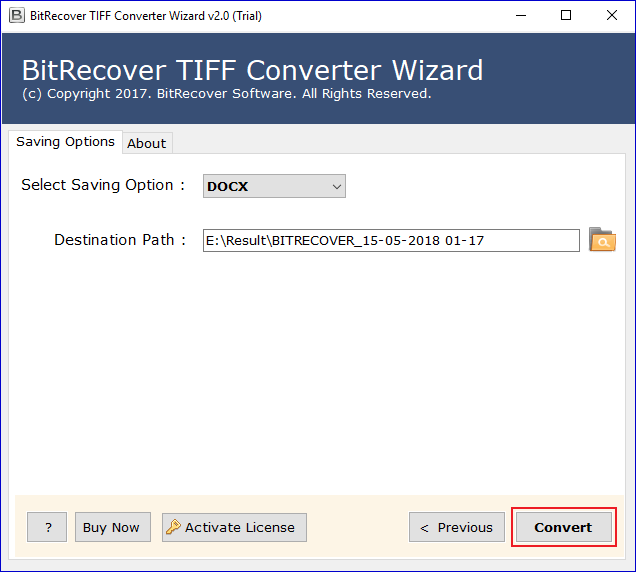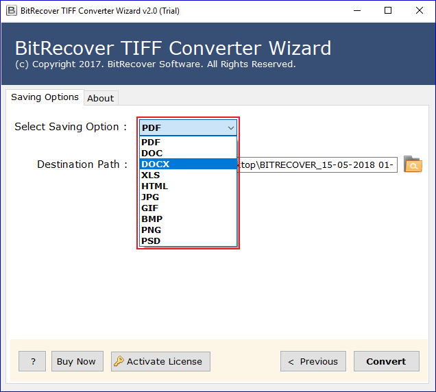 Bu dönüşümü elde etmek için Doc Dönüşüm Aracı'na BitRecover Tiff kullanın.
