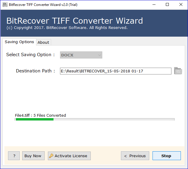 Bunu size bildirmek için küçük bir notBitrecover Tiff, Doc Converter'aşimdiye kadar satın aldığım en iyi uygulamalardan biri. Binlerce TIFF dosyasını Word'e kaydetmemi sağlayan olağanüstü bir yazılım. Çevrimiçi araçla omuzlarımdan büyük bir yük alır. Ancak, bu yardımcı programdan bahsetmek kesinlikle en iyisi ve harika bir ürün.