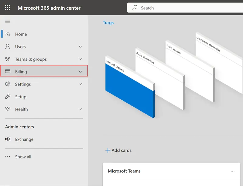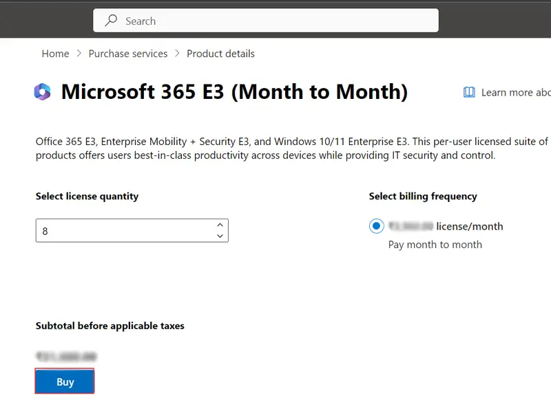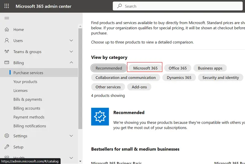 - Daha sonra seçinSatınalma Hizmetleri >> Microsoft 365seçenek.