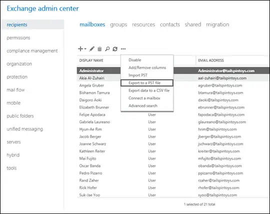 İlk olarak, posta kutusu verilerinizi PST'deki Exchange Server'dan dışa aktarmanız gerekir (Kişisel depolama tablosu) Biçim. Kullanıcı posta kutusu verilerini zaten PST biçiminde dışa aktardıysanız, bu adımı atlayabilirsiniz.