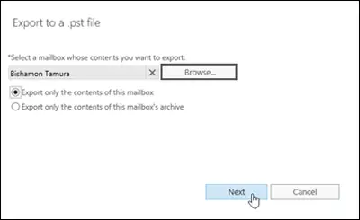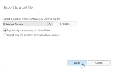 - Bir seçenek seçin:Yalnızca bu posta kutusunun içeriğini dışa aktarın veya yalnızca bu posta kutusunun arşivinin içeriğini dışa aktarın”Gereksinimlerinize göre. BasınSonrakidevam etmek için.