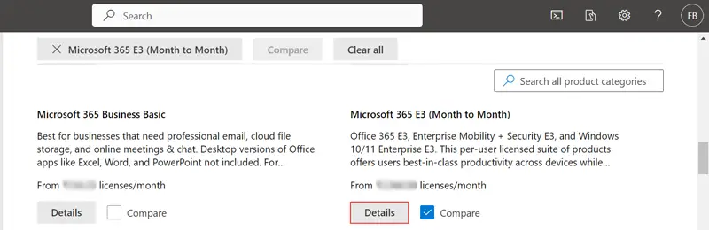 - SeçinOffice 365 Enterprise E3 veya E5Planlayın ve tıklayınDetaylar.