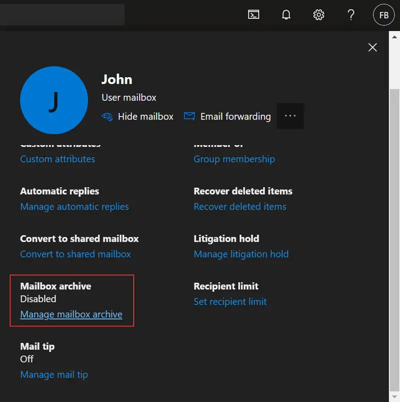 - Şimdi seçinPosta Kutusu Arşivini Yönetinseçenek.
