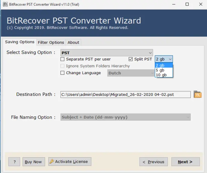 - Split PST Dosya seçeneğini etkinleştirin ve seçin20 GBBoyut.
