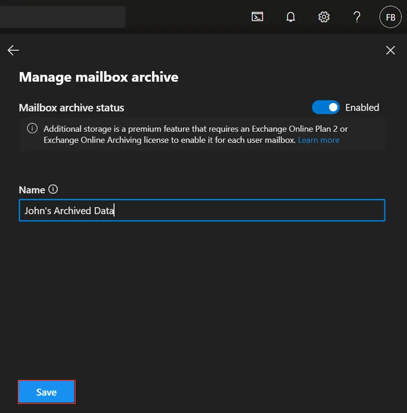 - Arşivi etkinleştirin, posta kutusu arşiv klasörüne bir isim verin ve basın.Kaydetmek.
