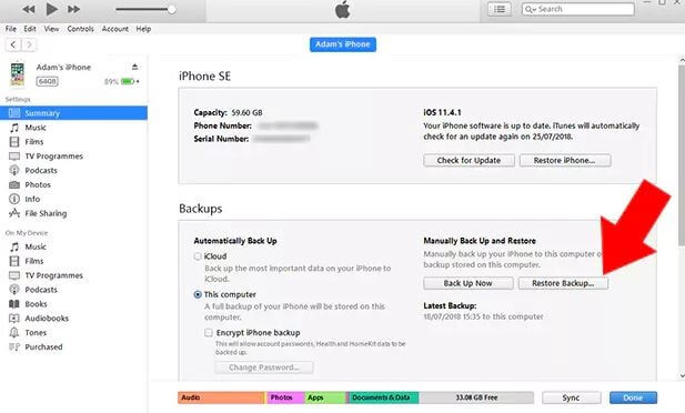 - B. İPhone'unuzu iTunes/Finder'da seçin ve “Yedekleme Geri Yükle” yi tıklayın.