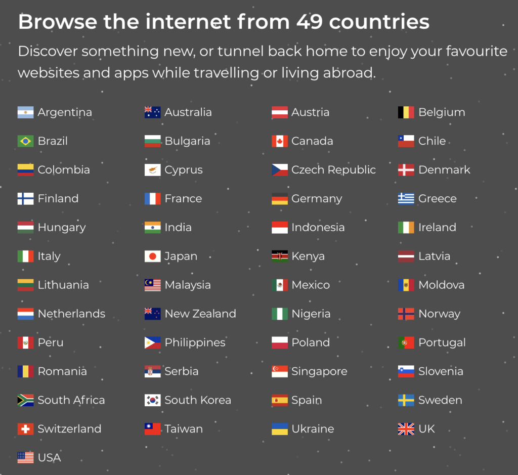 Kullanıcılarla popülaritesine rağmen,Tunnelbear Sunucu Ağıher şey söylendiğinde ve yapıldığında küçük. Tam olarak 49 ülkede faaliyete geçiyor.