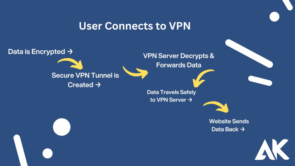 - VPN Sunucusu verilerinizi şifresini çözer ve bir web sitesi yükleme gibi isteğinizi yürütür.