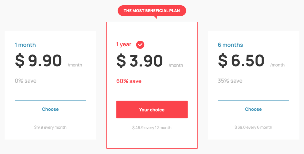 Fiyatlandırma, taahhütte bulunmak istediğiniz süreye bağlı olarak üç katman arasında bölünür. Bir ay (9,90 $/ay), altı ay (6,50 $/ay) ve 12 ay (3.90 $/ay) sözleşmeler arasında karar verebilirsiniz, ya da en azından teoride böyle çalışması gerekiyordu. Whoer VPN'de geldikçe anlaşmalar sunduğumuzu unutmayın.