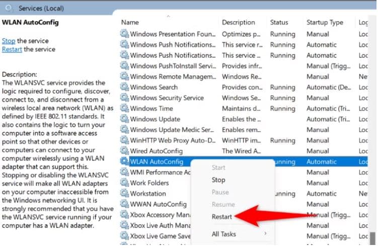 - Hizmetler listesini aşağı kaydırın, WLAN Otomatik Yapılandırma'ya sağ tıklayın ve Yeniden Başlat'ı seçin. Seçenek gri görünüyorsa Başlat'ı seçin.