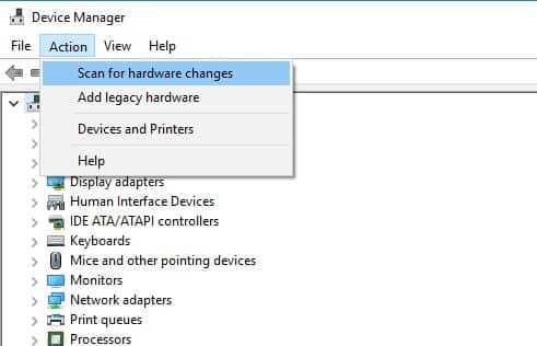Değilse, Aygıt Yöneticisi'ni tekrar açın ve Eylem'e tıklayın.Donanım değişikliklerini tarayın,ve sorunun çözülüp çözülmediğini kontrol edin.