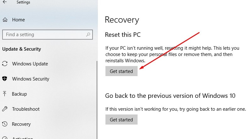 Ayrıca büyük sorunlar bulduysanız ve farklı sorun giderme adımları gerçekleştirdikten sonra hala sorun yaşıyorsanız. Ardından, sorunların çoğunu düzeltmek için pencereleri varsayılan kurulumuna sıfırlayabilirsiniz. Windows 10'u yenilemek veya sıfırlamak için Ayarları Aç -> Güncelleme ve Güvenlik -> Kurtarma. Ardından etiketlenmiş bölüme gidinBu bilgisayarı sıfırlayınVe tıklayınBaşlamakdüğme.