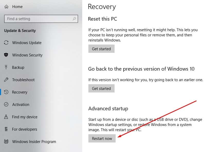 Windows 10'u güvenli modda başlatmak için gelişmiş başlangıç seçeneklerine gidin. Bunu ayarlardan yapabilirsiniz -> Güncelleme ve Güvenlik -> Kurtarın. Burada orta bölmede etiketli bölüme doğru kaydırınGelişmiş başlangıç. TıklayınŞimdi yeniden başlatdüğme.