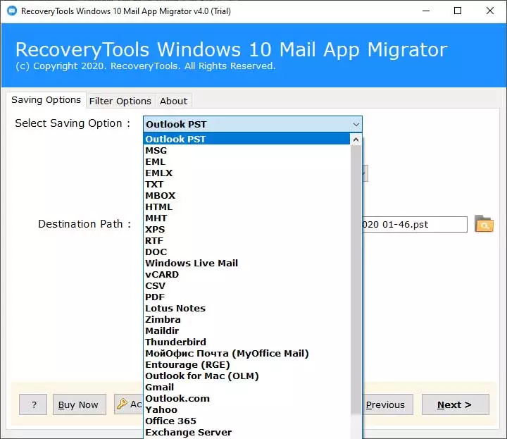 - PDF, PST, DOC, MSG, Mbox ve diğerleri dahil olmak üzere çeşitli dosya formatlarında yedeklemeleri kaydedebilir.