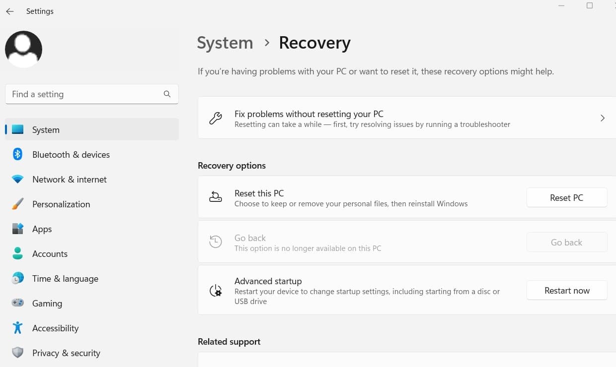 - Sistemde gezinin, ardından kurtarma yapın ve Gelişmiş başlatmanın yanındaki Şimdi yeniden başlat düğmesine tıklayın.