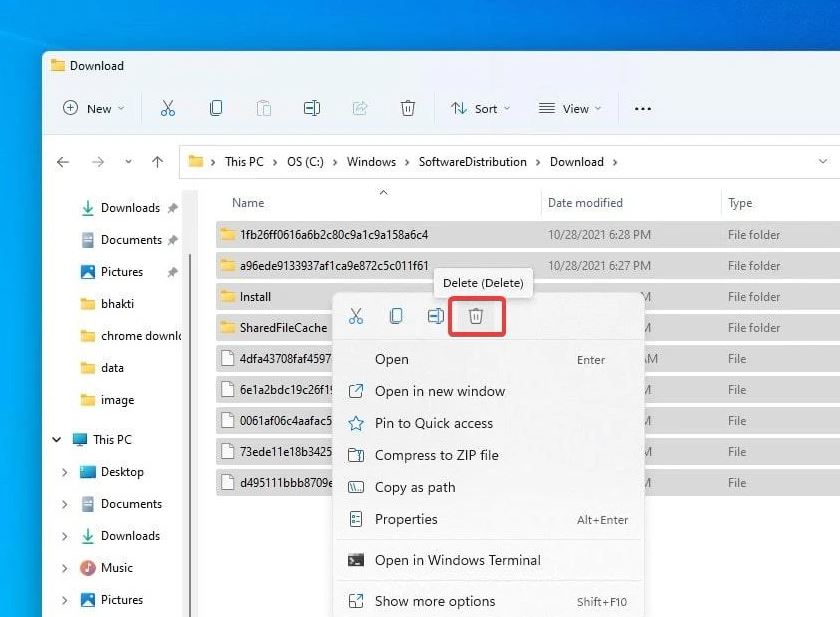 - Şimdi Windows tuşu + E'ye basın ve C:WindowsSoftwareDistributionindirilenler indirmelerine gidin