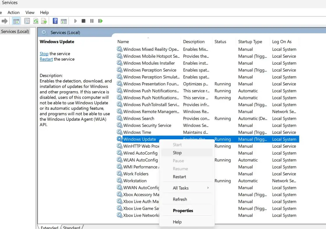 - Windows güncelleme hizmetini bulmak için aşağı kaydırın, sağ tıklayın, durdur'u seçin,