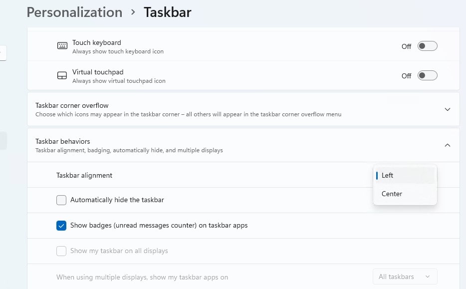 - Aşağı kaydırın ve görev çubuğu davranışlarını bulun, ardından görev çubuğu hizalamasını sola değiştirin.