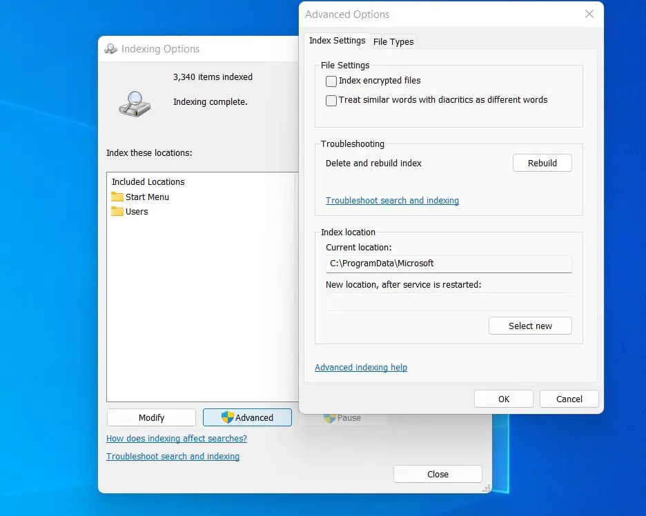 - Arama dizinini yeniden oluşturun: Dosya> Seçenekler> Arama> Dizin Seçenekleri> Gelişmiş> Yeniden Oluşturma.