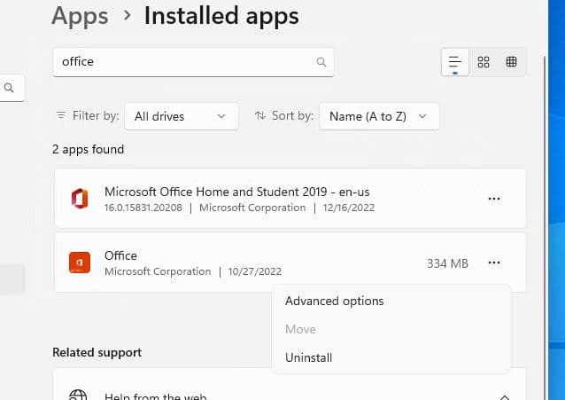 Yerleşik Office uygulamasını kullanıyorsanız, üç nokta menüsünü tıklayın ve Gelişmiş Seçenekleri seçin