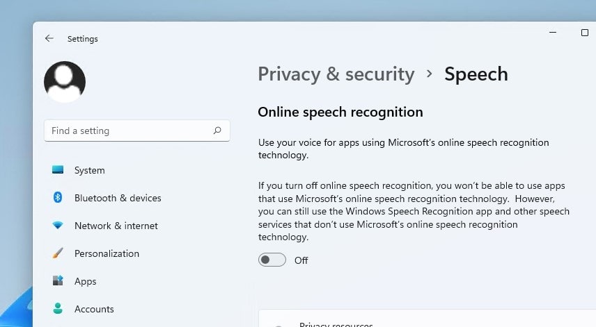 Ardından, mikrofonumuz varsa hiçbir şeyin duyulmadığından emin olmak için çevrimiçi ses tanımasını devre dışı bırakın. Bu, Microsoft'un sesli verilerinizi buluta göndermesini ve böylece gizliliğinizi korumasını önleyecektir.