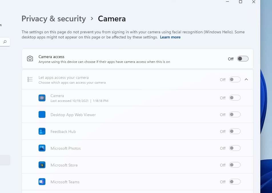 - İzin ayarları altında kamera seçeneğini aşağı kaydırın ve genişletin ve “Kamera Erişim” geçişini kapatın.