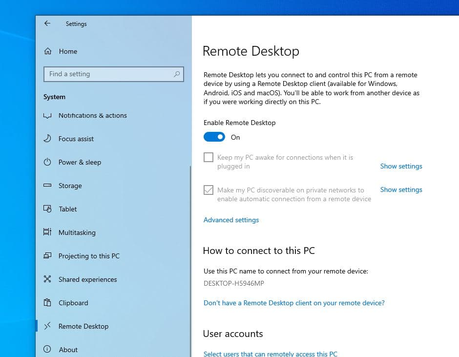 Kontrol etmeniz ve doğrulamanız gereken ilk şey,Uzak masaüstü özelliği etkinhem uzak bilgisayarda hem de yerel sistemde.