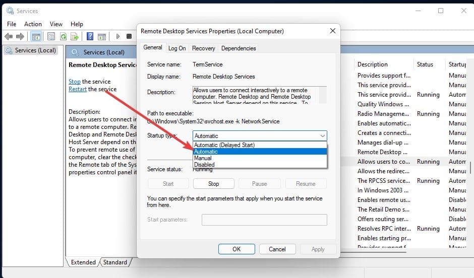 Windows 11'de uzak bağlantı kurmak için Uzak Masaüstü hizmetinin Windows'ta etkinleştirilmesi ve çalışıyor olması gerekir. Uzak masaüstü oturumları için altyapı ve işlevsellik sağlayarak kullanıcıların uzak bir sistemin masaüstü ortamına yerel bir bilgisayardan erişmesine ve bu ortamı kontrol etmesine olanak tanır. Herhangi bir nedenle bu hizmet başlatılmazsa veya çalışır durumda kalırsa Uzak bilgisayara bağlanırken sorun yaşayabilirsiniz. Uzak masaüstü hizmetini kontrol edip yeniden başlatalım.