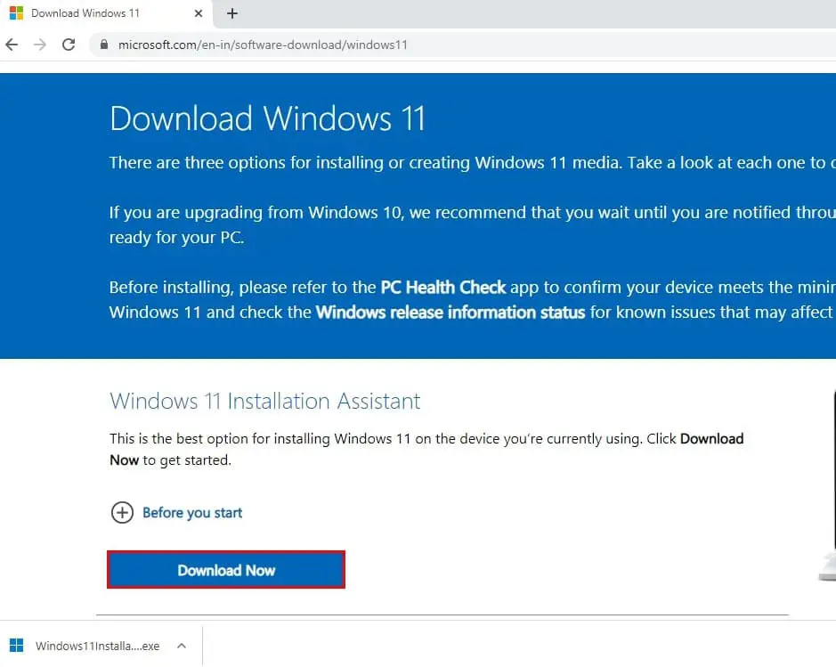 - Windows 11 Kurulum Asistanını indirmeye başlamak için bu bölümün altında bulunan "Şimdi İndir" düğmesini tıklayın.