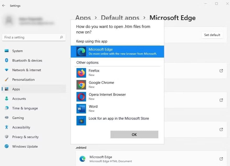 - Burada, bir tarayıcıda açılan tüm dosya türlerini göreceksiniz. Her dosya türünü tek tek tıklayın ve seçinMicrosoft EdgeVarsayılan olarak ayarlamak için.